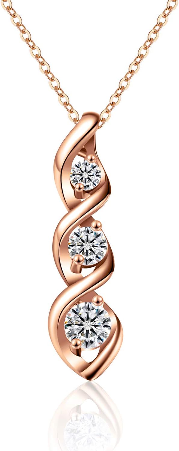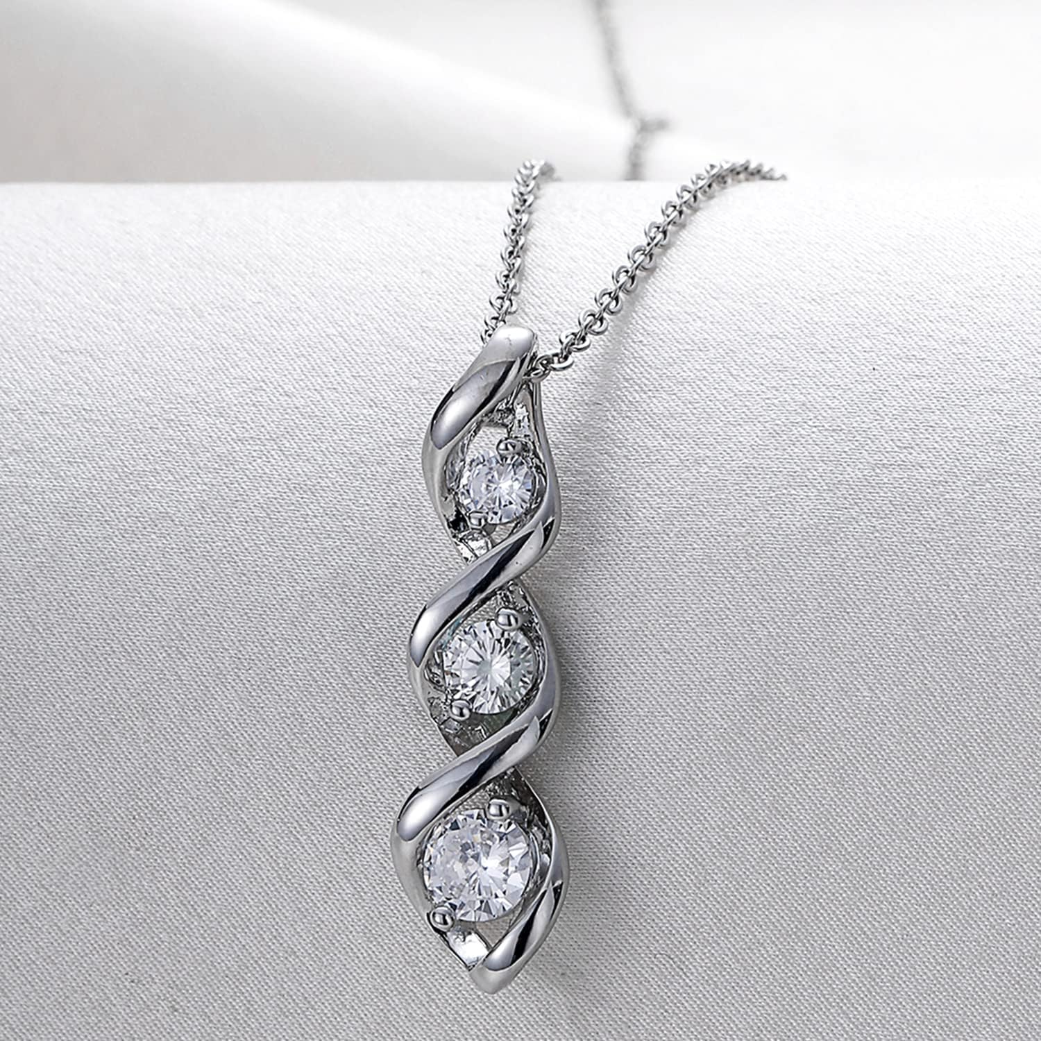 This elegant necklace features a graceful, swirling design with three sparkling 5A cubic zirconia stones. The pendant has a unique, flowing shape, with each stone nestled within a curved setting. The necklace is crafted from sterling silver, and plated with14K gold, rose gold, . The delicate chain is adjustable, offering versatile styling options. This necklace is perfect for adding a touch of sophisticated sparkle to any outfit.