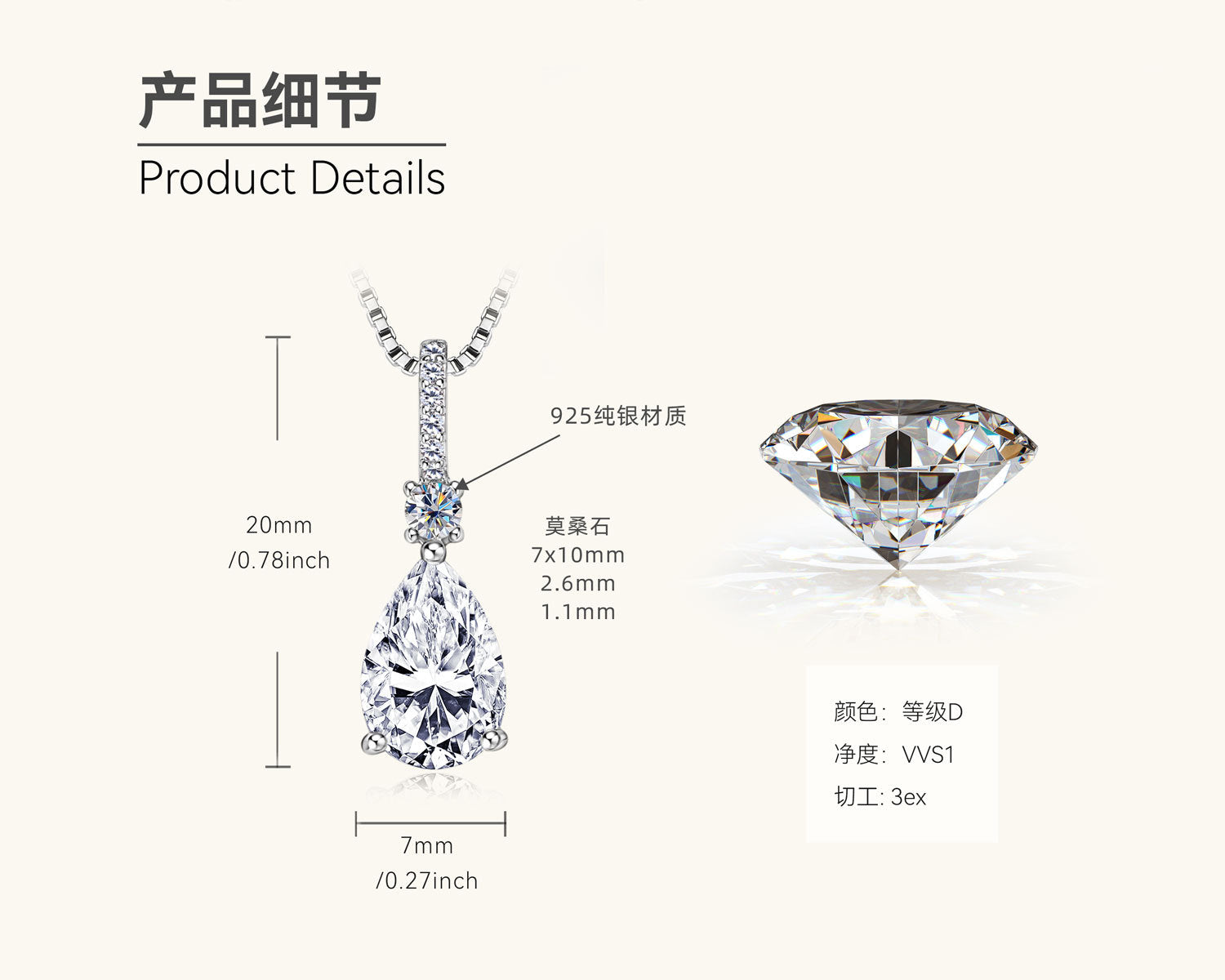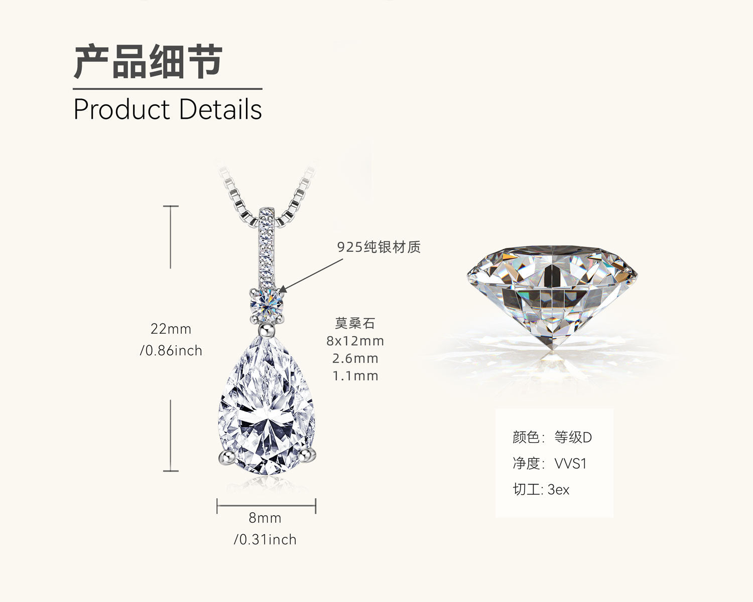 This elegant statement necklace features a large, brilliant pear-shaped (teardrop) moissanite gemstone as its focal point. The pendant is crafted from 925 sterling silver. The main moissanite stone measures 8x12mm. The pendant also features smaller accent moissanites: one measuring 2.6mm and another measuring 1.1mm, adding extra sparkle to the setting. The moissanite stones are of high quality, boasting a D color grade (colorless) and VVS1 clarity (virtually flawless). They are expertly cut with a 3ex (Excellent cut, polish, and symmetry) grade to maximize their brilliance and fire.