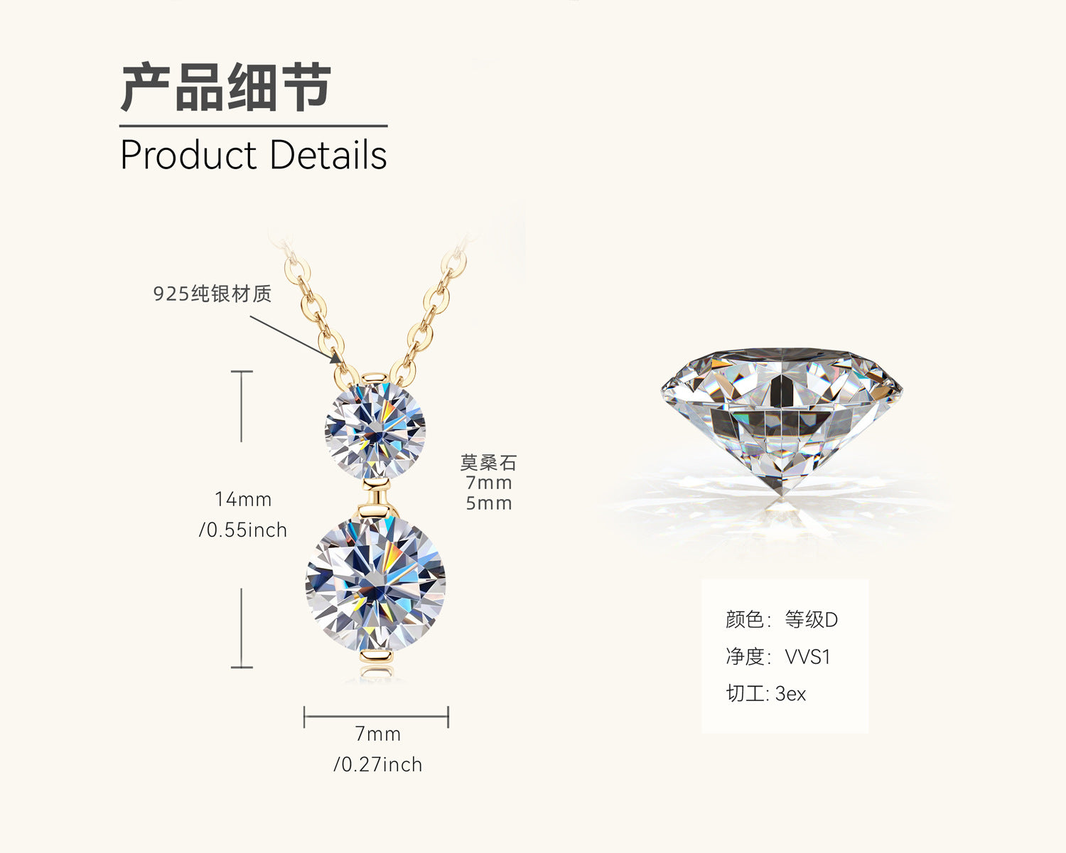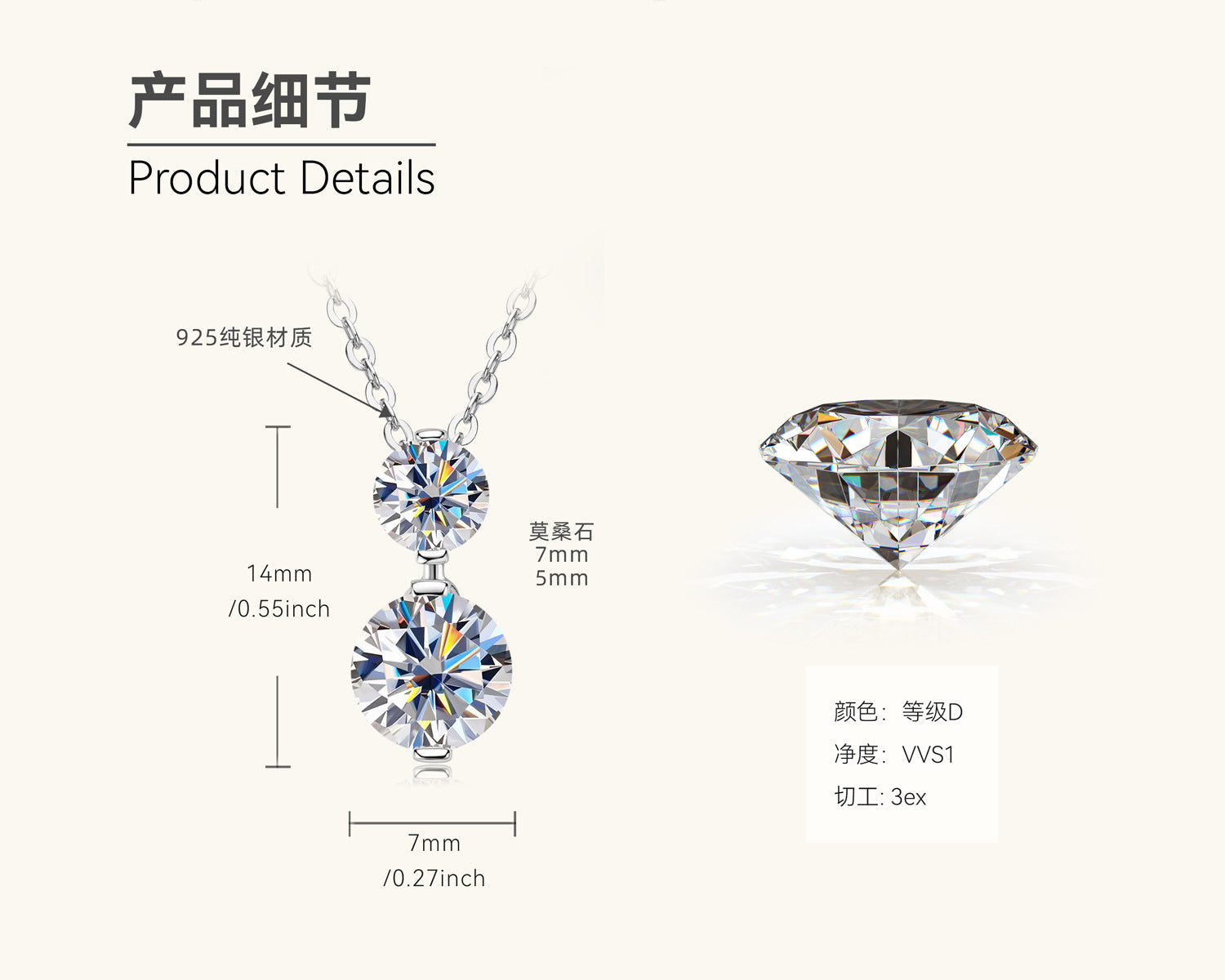 This stylish necklace features a modern two-stone drop pendant showcasing the exceptional brilliance of moissanite gemstones. The pendant is crafted from 925 sterling silver and features two sparkling moissanite stones: a larger pear-shaped stone measuring 7mm and a smaller round stone measuring 5mm. Both moissanite stones are of high quality, boasting a D color grade (colorless) and VVS1 clarity (virtually flawless). They are expertly cut with a 3ex (Excellent cut, polish, and symmetry) grade to maximize their brilliance and fire.