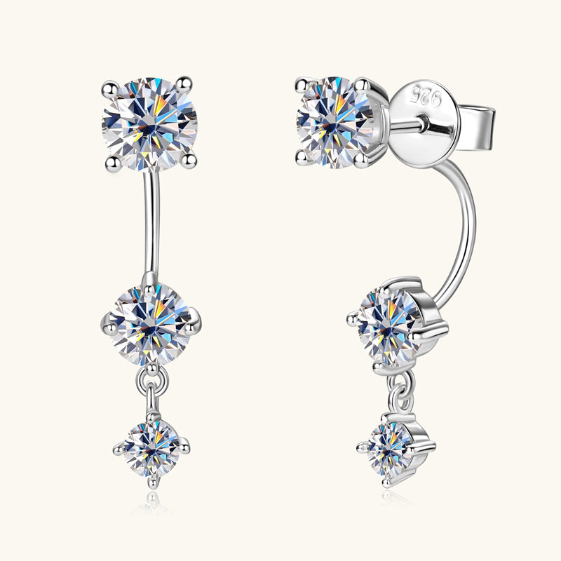 Capture the light with these dazzling moissanite linear drop earrings. Each earring showcases three brilliant moissanites, graduating in size from 3mm at the bottom to 5mm at the top. This graduated design creates a dynamic and eye-catching sparkle. The moissanites are graded D in color (colorless), VVS1 in clarity, and have an excellent 3ex cut for maximum brilliance. The earrings are crafted from 925 sterling silve
